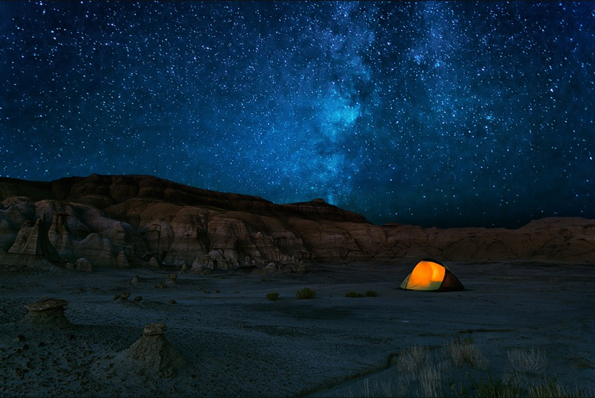 For starters, as Yiming Hu says, “Modern digital cameras need a combination of large aperture, high ISO and long exposure time to properly capture the stars of the night sky.” When he was photographing the Bisti Badlands in New Mexico, he wanted to include the night sky, the illuminated tent and the surrounding area, so he chose to use a wide-angle lens at its shortest focal length of 17 mm. Consequently, he calculated the exposure time by dividing 500 by 17, which resulted in a 30-second exposure and produced this exquisite capture of the sky.