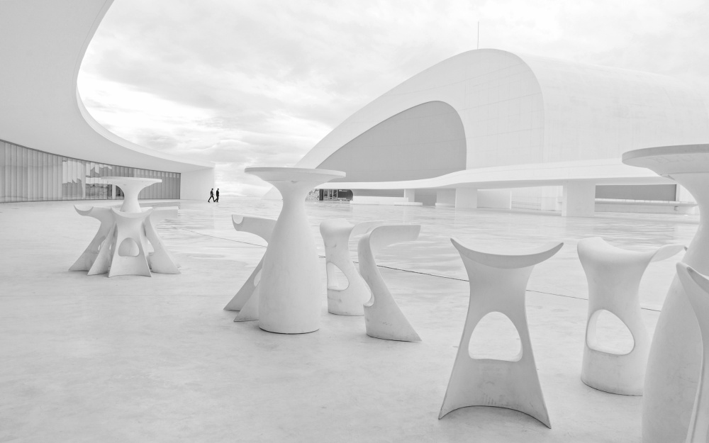Once I arrived at the Niemeyer, I walked around to find a suitable location. I was constantly sketching pictures in my mind every step I took through that magical place. After a while I stumbled across the perfect spot to photograph. It was next to the cafeteria, and the chairs and tables formed curved lines that blended in beautifully with the rest of the wavy, undulating architecture surrounding them. Of course this was the place! I wanted to give the photograph a more urban quality, though, and to do that I needed some people. Fortunately I found two tourists who were sitting and having coffee in the cafeteria, and I explained my idea to them. They kindly agreed to participate.