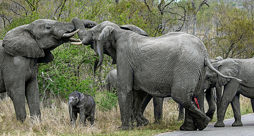 Ivory tusks rattle and clatter as two giant elephants – one male and one female – clash head on in a show of force. Between them, dwarfed by their stature, stands a bewildered new-born elephant calf.